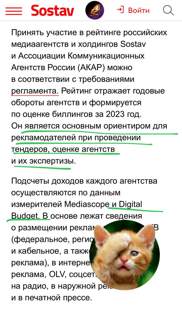 😂 «Рейтинг является основным ориентиром для рекламодателей при проведении тендеров, оценке агентств и их экспертизы. Подсчеты доходов каждого агентства осуществляются по данным … Digital Budget.»