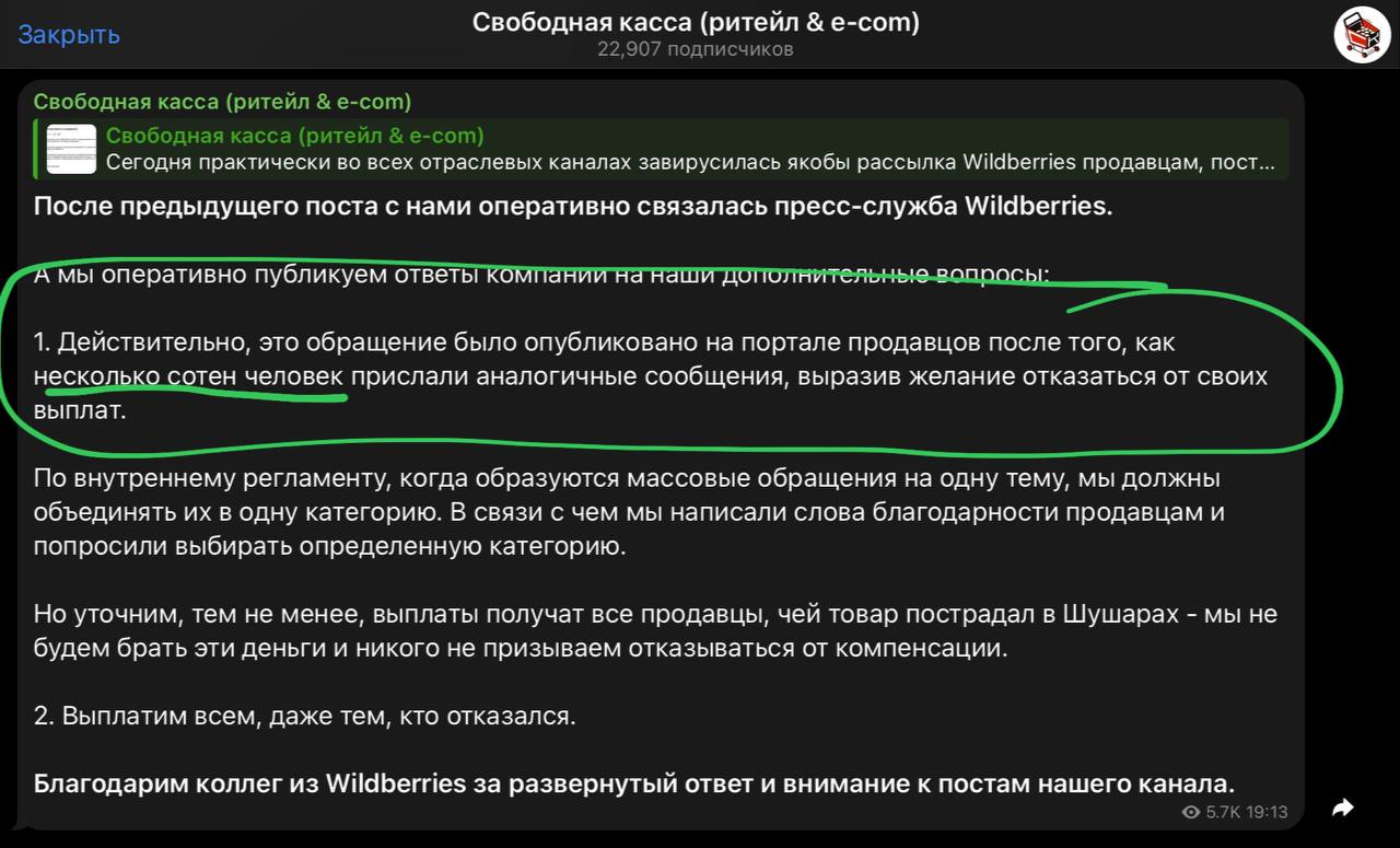 😂 Оказывается, вчера Wildberries успели дать комментарий каналу «Свободная касса» по наивному предложению продавцам поддержать родной маркетплейс и отказаться от выплат за сгоревшее.