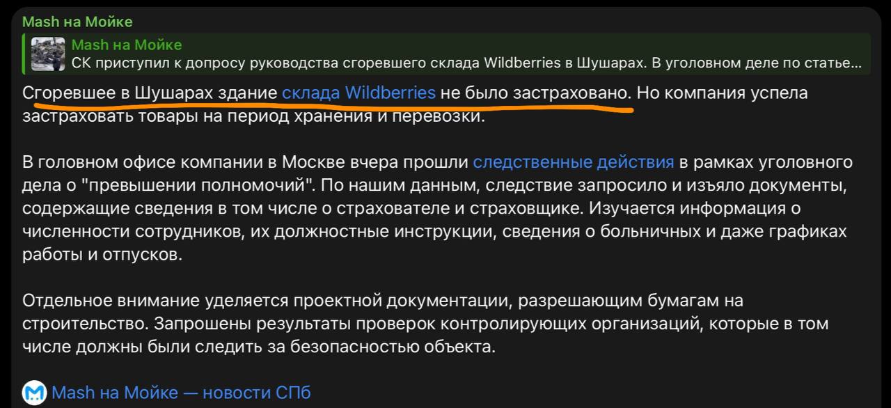 ⚡️ «Сгоревший склад не был застрахован», — новостной цирк вокруг сгоревшего Wildberries — не утихает. Какие еще невероятные обстоятельства достанут из рукава следственные органы?
