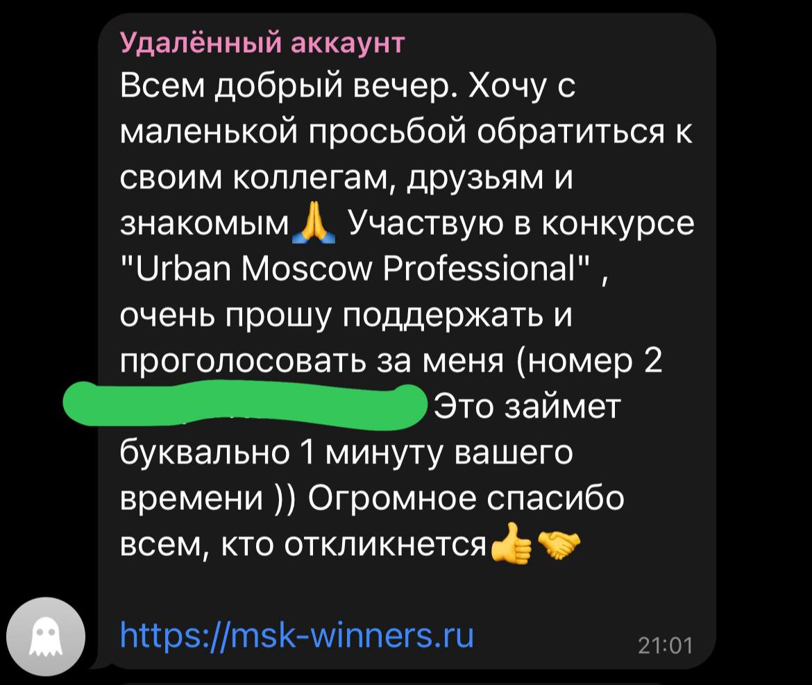 2. Сообщает что участвует в конкурсе. Просит проголосовать за себя. Конкурс, кстати, по профилю деятельности — в данном случае девелоперские менеджеры.