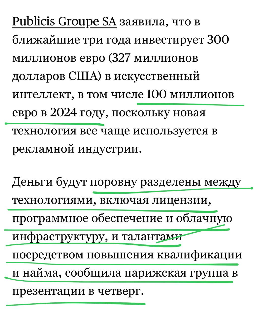 🤓 Состав перепечатал у Адпаса новость с Блумберга о том, что глобальный Публицис сказал, будто намерен потратить 100 лямов евро на «эти ваши искусственные интеллекты» в 2024 году.