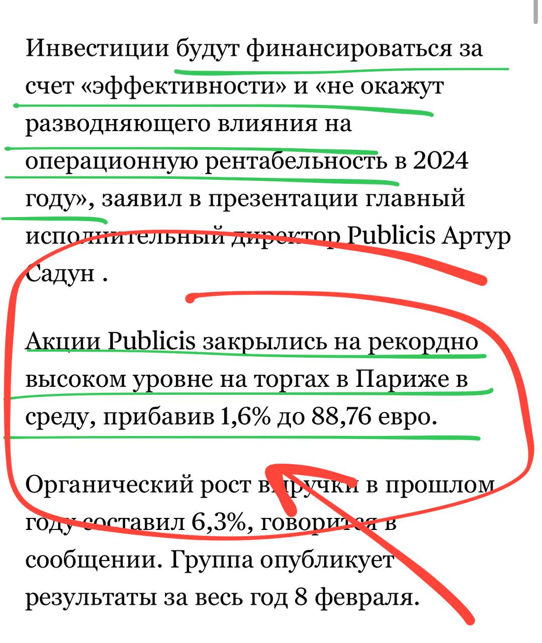 3. И самое интересное — эффект заявления. Акции Publicis закрылись на рекордно высоком уровне на торгах в Париже в среду, прибавив 1,6% до 88,76 евро. Собственно, для того и болтанули…