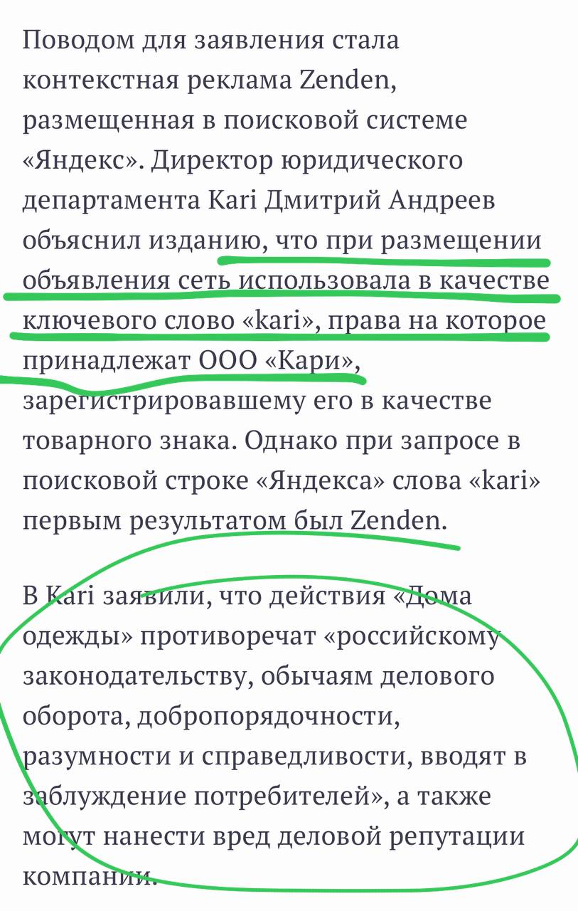 «В Kari считают, что действия конкурентов противоречат «российскому законодательству, обычаям делового оборота, добропорядочности, разумности и справедливости, вводят в заблуждение потребителей» и направлены на получение Zenden преимуществ в предпринимательской деятельности, а также могут нанести вред деловой репутации компании или даже причинить убытки.»