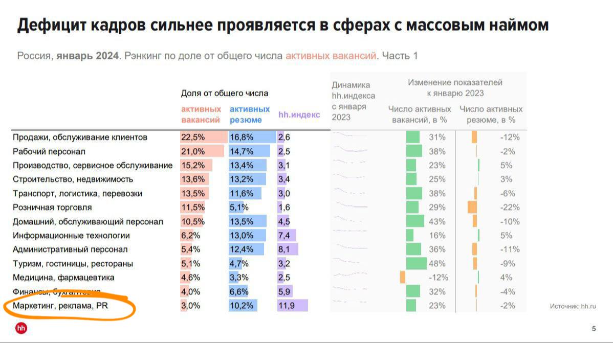 🤓 В маркетинге, рекламе и PR — дефицита кадров не наблюдается сильнее всего. Сообщает нам январский HH. Расходимся, уважаемые товарищи.