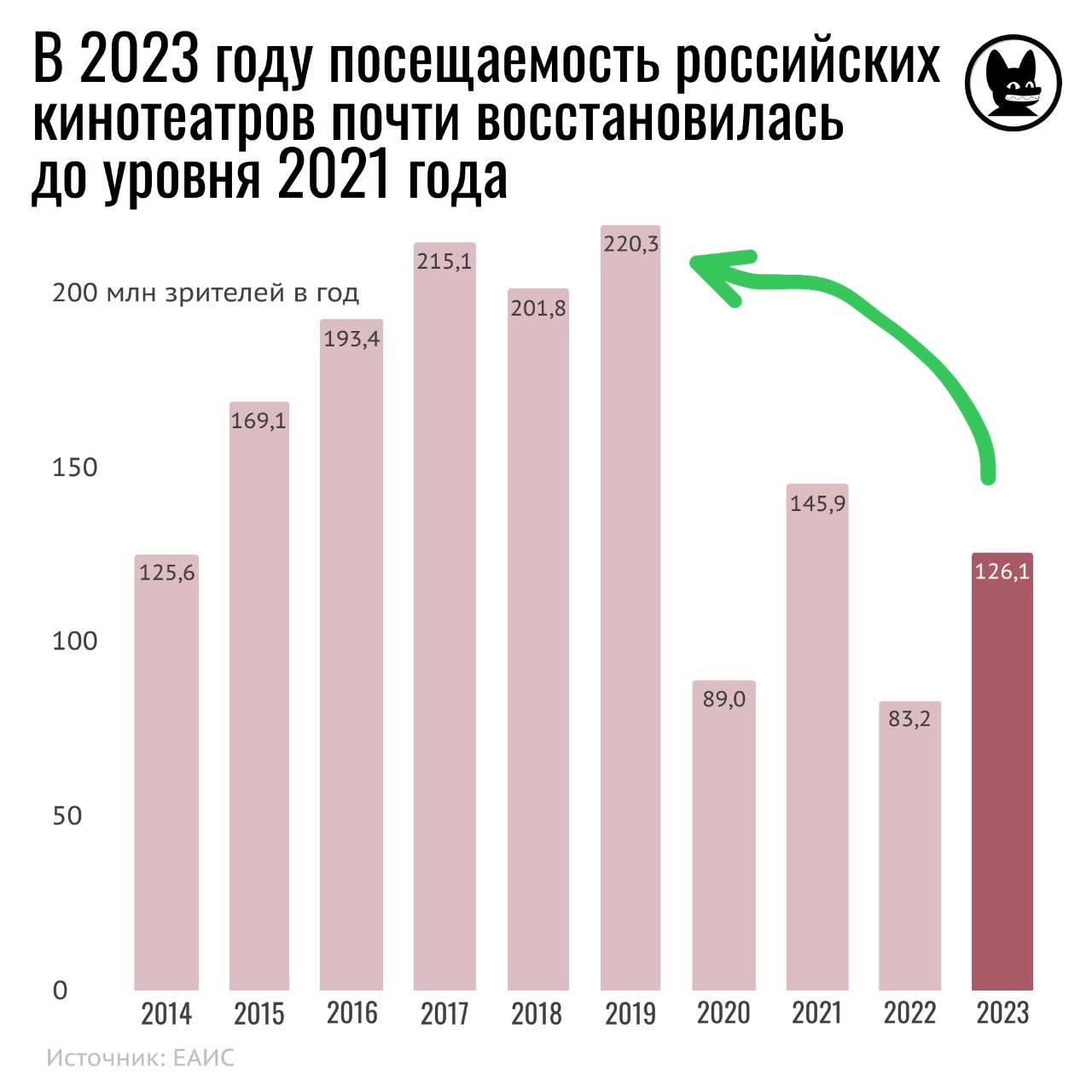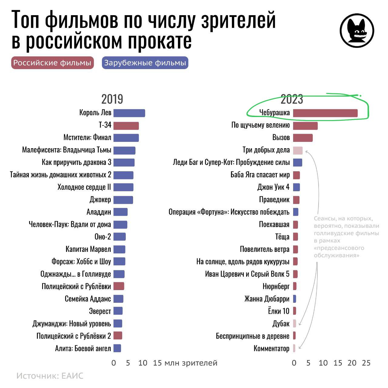 🤓 Очень забавное распределение. В сравнении с 2019 годом, первый в ТОП3 фильмов в российском прокате — собирает существенно больше, вторые два — столько же, а все остальные — существенно меньше.