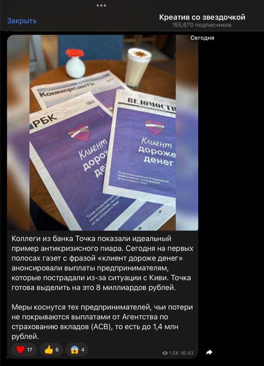 π Π Π±Π°Π½ΠΊΠ΅ Π’ΠΎΡΠΊΠ° ΠΏΠ΅ΡΠ΅ΠΏΡΡΠ°Π»ΠΈ PR-ΠΊΠΎΠΌΠΌΡΠ½ΠΈΠΊΠ°ΡΠΈΠΈ Ρ ΠΏΡΡΠΌΠΎΠΉ ΡΠ΅ΠΊΠ»Π°ΠΌΠΎΠΉ ΠΈ Π·Π°ΠΊΠ°Π·ΡΡ ΠΎΠΉ Π² ΠΊΠ°Π½Π°Π»Π°Ρ ΠΏΡΠΎ ΠΊΡΠ΅Π°ΡΠΈΠ²ΡΠΈΠΊΠΈ.
