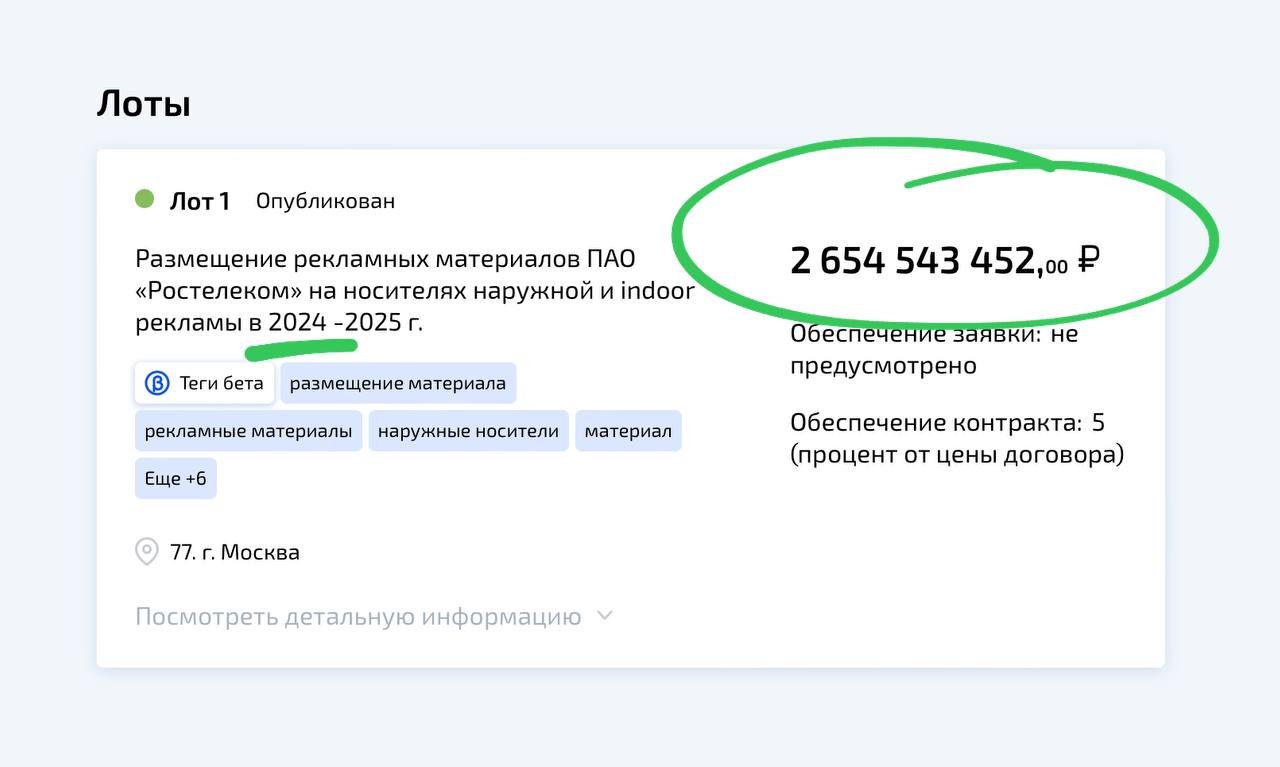 🤓 А вот, например, Ростелеком тендерит контракт на размещение в наружке суммой 2,6 ярда в середине марта.