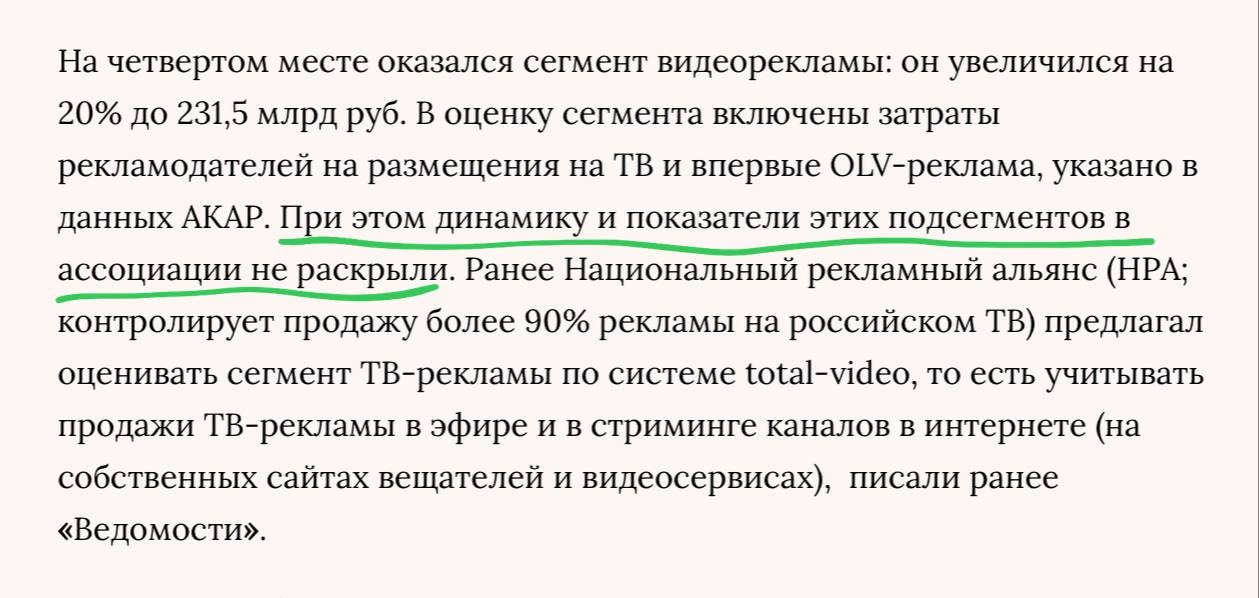 «В оценку сегмента включены затраты рекламодателей на размещения на ТВ и впервые OLV-реклама, указано в данных АКАР. При этом динамику и показатели этих подсегментов в ассоциации не раскрыли.»
