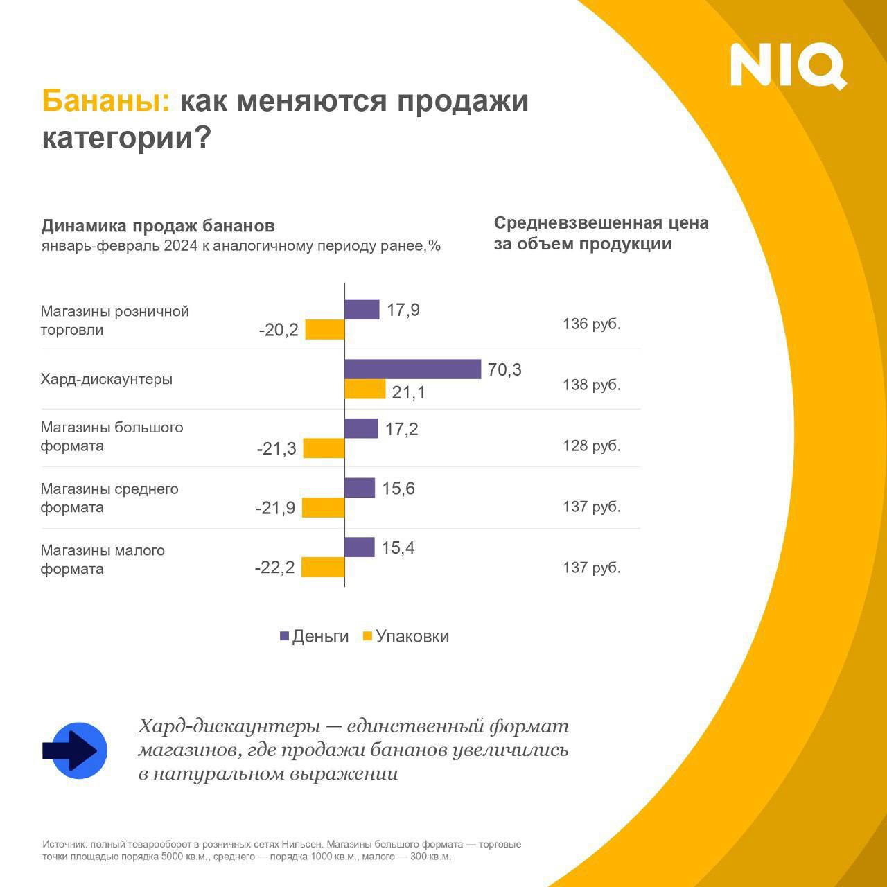 🤔 Не можем не обратить внимание на исследование потребительской динамики на рынке бананов. Нильсен сообщает, что во всех сегментах наблюдается падение продаж этих тропических фруктов — и только в хард-дискаунтерах они худо-бедно растут.