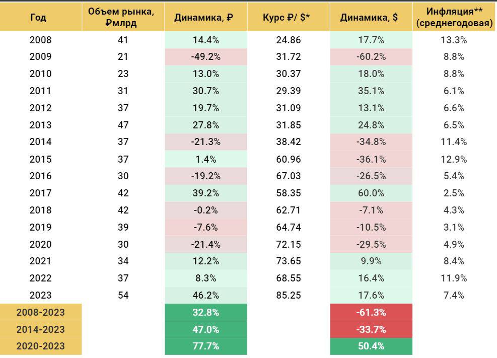 🤔 Если грубо пересчитать табличку Адиндекса по наружной рекламе, то за 10 лет (2013 к 2023) в долларе рынок упал в 2,5 раза…