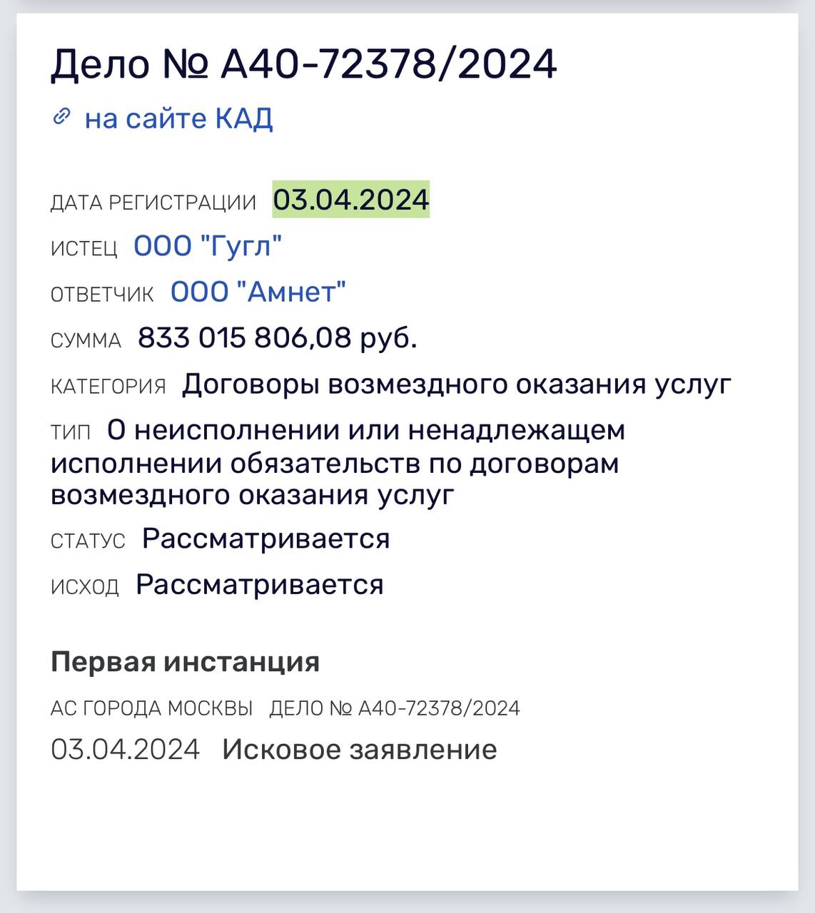 Сумма претензий — 833 миллиона рублей, согласно данным Rusprofile.