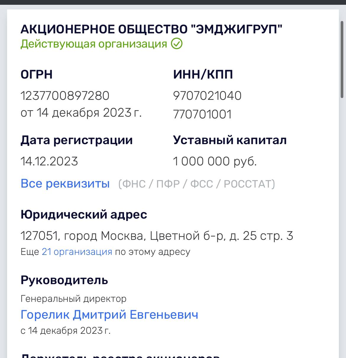 И, кстати, в конце 2023 года над МЖкомом выросла новая управляющая структура АО «Эмджигрупп» (сообщает Rusprofile). Полагаем, в нее были переведены какие-то офшорные схемы управления.