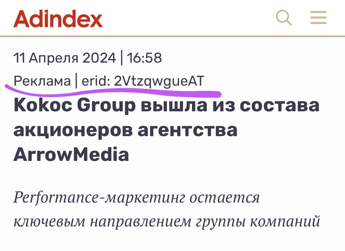 🤔 Кокос публично разошелся и исторг Эроу медиа из лона группы активов. Настолько публично, что даже проплатил рекламный текст на Адиндексе.