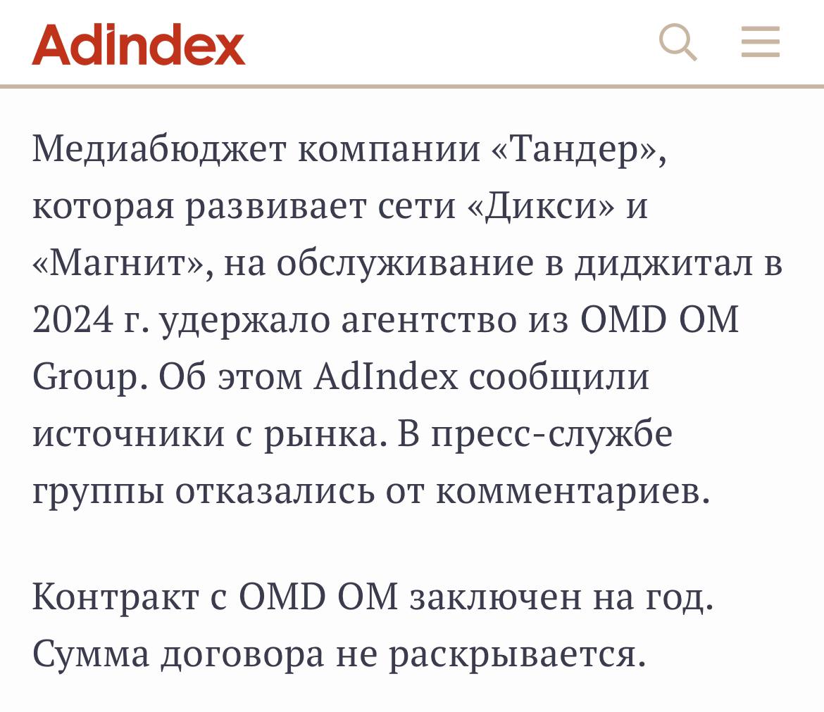 🤓 Диджитальный бюджет Тандера (Магнит) остался в ОМД. Тендер проводился в январе…