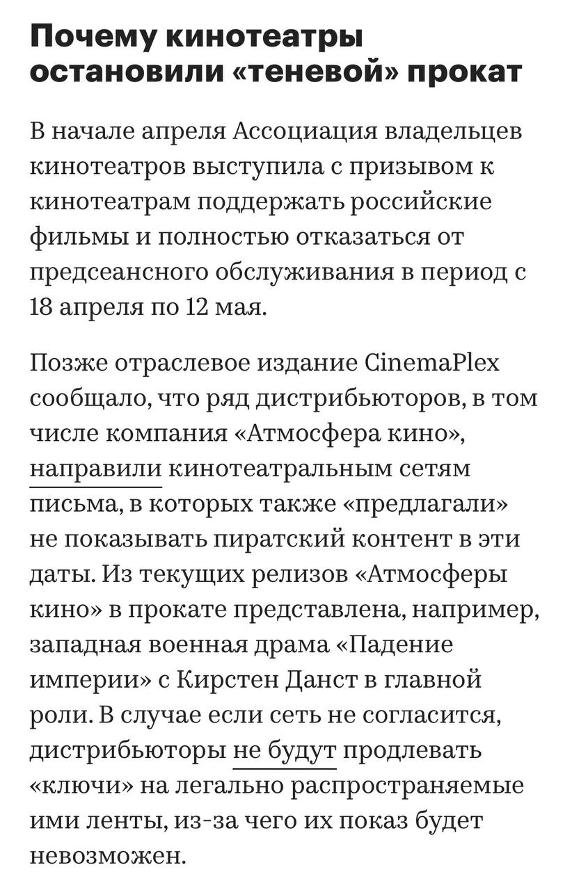 🤓 Кинопрокатчики заставили кинотеатры приглушить конкурирующие мировые фильмы (демонстрируемые на пиратских основаниях) в пользу отечественных.