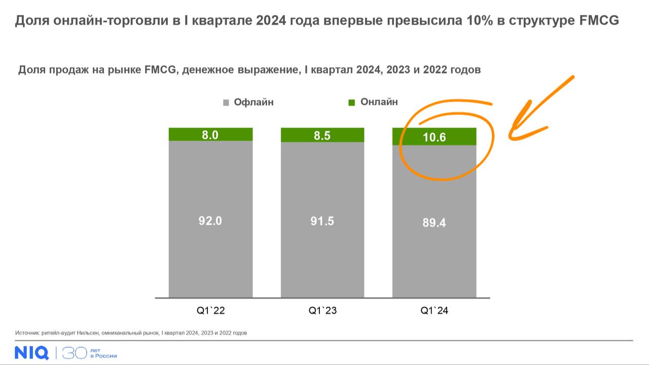 Ну и да, доля онлайна в структуре всей FMCG-розницы теперь больше 10%. Вангуем, кстати, стремительный рост до 50%, потому что — зачем ходить в магазины, если теперь можно не ходить?