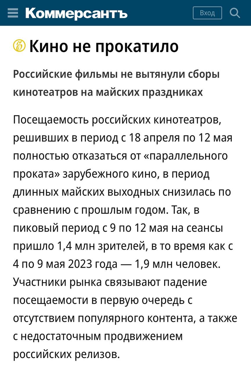 🤓 Интересно. Посещаемость российских кинотеатров, решивших в период с 18 апреля по 12 мая полностью отказаться от «параллельного проката» зарубежного кино, в период длинных майских выходных снизилась по сравнению с прошлым годом.