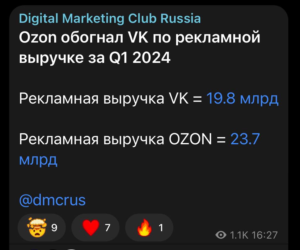 🤔 Сегодня коллеги которые умеют считать сообщают о замечательном факте: Озон обогнал ВК по рекламной выручке в q1 2024.