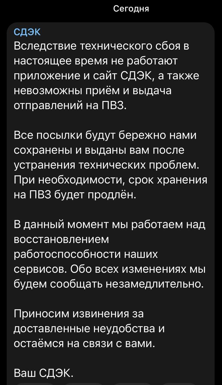 🤓 Сообщают, что СДЭК совсем сломался. Ничего и нигде не принимают и не выдают со вчерашнего дня. Все клиентские инструменты тоже отключены, в том числе: сайт, доступ к личным кабинетам и горячая линия.