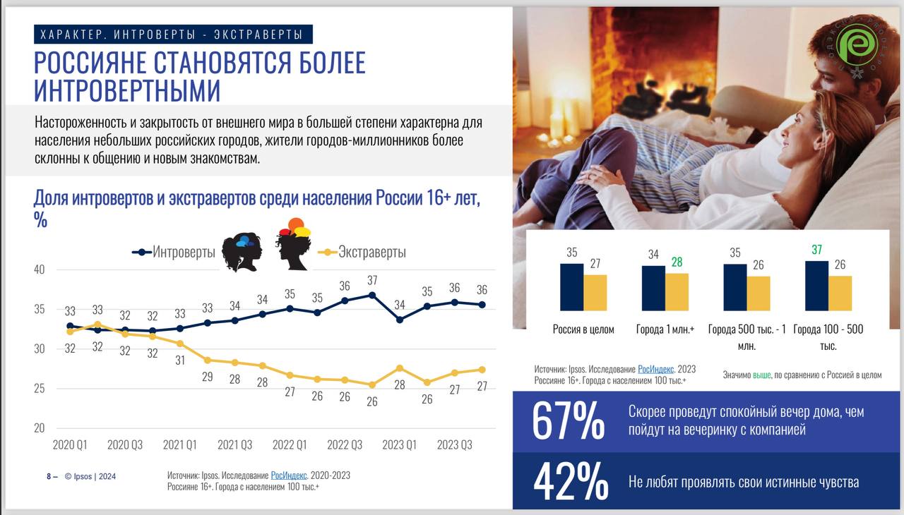 1. Люди замыкаются в своем мире. Доля «интровертов» растет, «экстравертов» падает. Тут — про жилье, квартиры, ремонты, обособление, способ досуга, доставку на дом и пр.