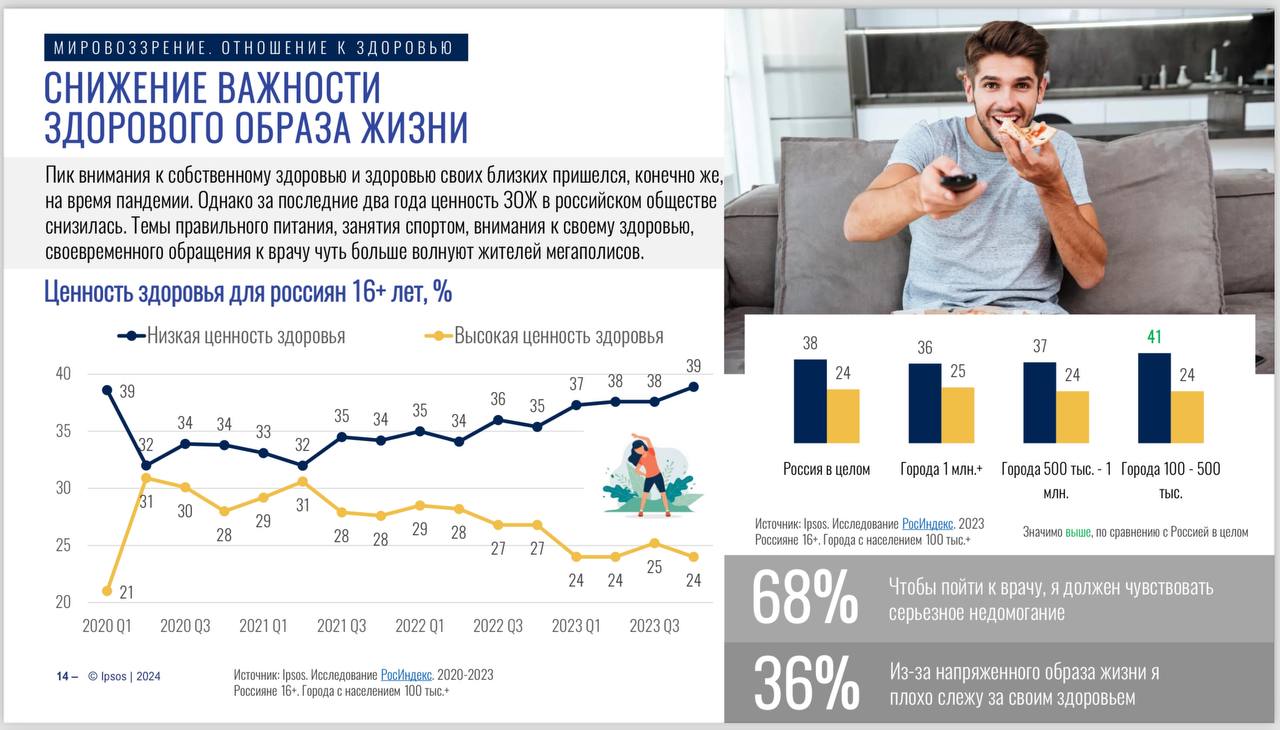 4. ЗОЖ — это звиздежь. Очевидно, мы проехали пик этой темы 10 лет назад, а влияние коронавируса на ЗОЖ-целеполагание, можно назвать скорее негативным. Зачем бегать через силу и жрать невкусную морковку, если куча триатлонистов и биохакеров вокруг умерло от этой дряни?
