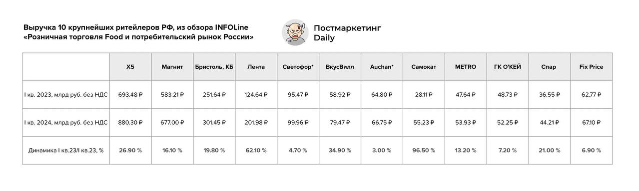 🤓 Infoline посчитал выручку первого квартала 2024 г. для ТОП-10 сетей FMCG, а мы почистили их табличку с выгрузкой. Вот какие получаются цифры☝🏻.
