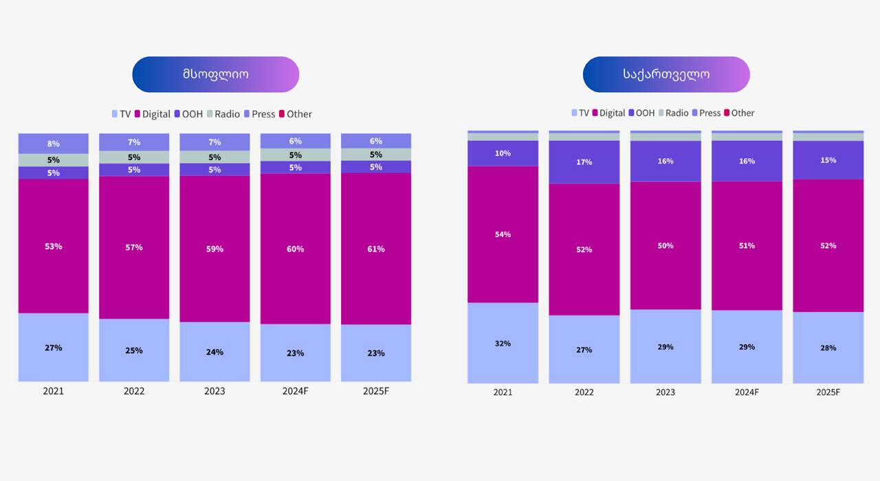🤓 А вот — распределение затрат грузинских рекламодателей (картинка справа) в сравнении со средне мировыми (картинка слева).