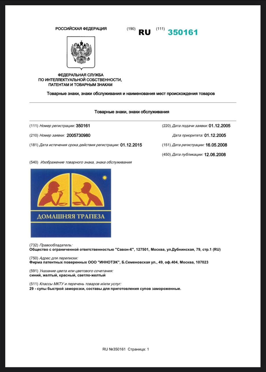 🤓 Товарный знак «Домашняя трапеза» для продукции в единственном классе «супы замороженные» от производителя «Савон-К».