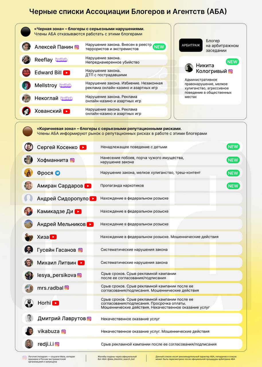 🤓 Свежая доска позора от АБА (Ассоциация Блогеров и Агентств), которые ведут список неблагонадежных площадок в соцсетях.