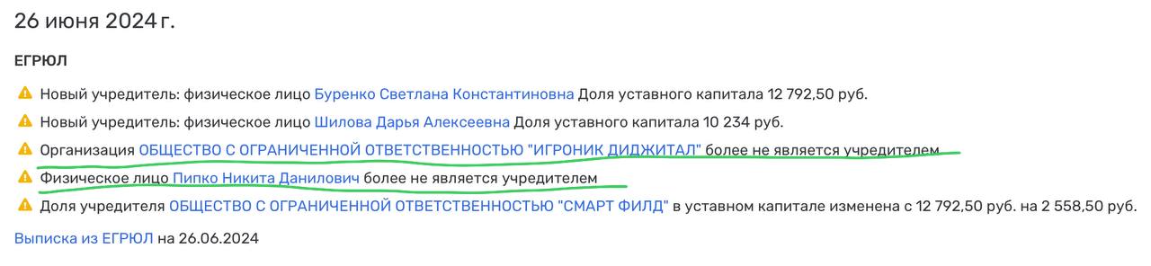 🤓 26 июня Игроник Диджитал и персонально Никита Данилович Пипко вышли из состава юрлица Хади (бывшая РА Максима), которое мы ранее атрибутировали как совместное юрлицо распиаренного альянса с АДВ.