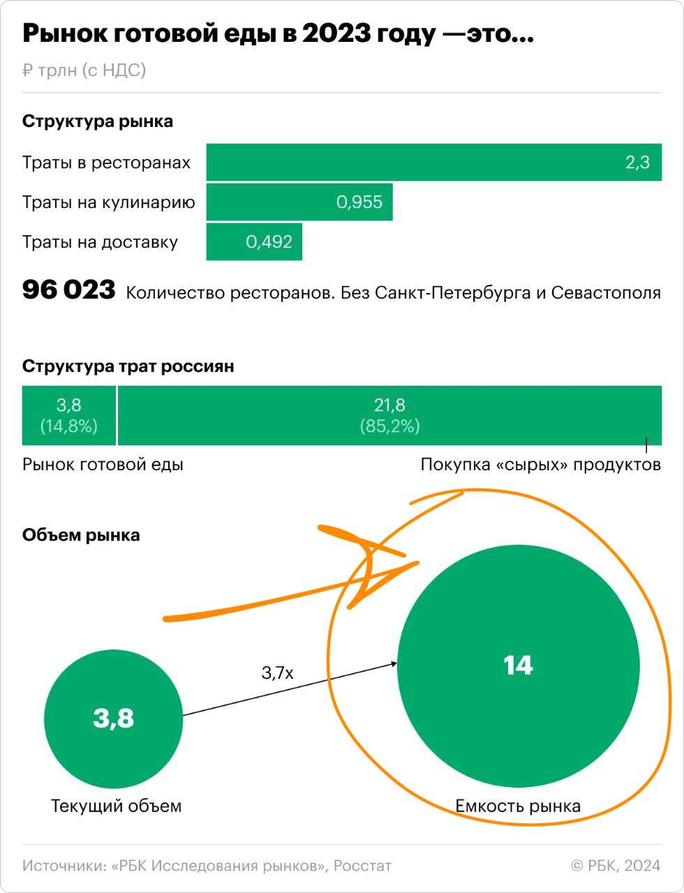 К чему это мы? Потенциальный объем рынка готовой еды в России - 14 трлн руб., что в 3,7 раза больше текущего объема рынка, который оценивается в 3,8 трлн руб. (данные «РБК Исследования рынков»).