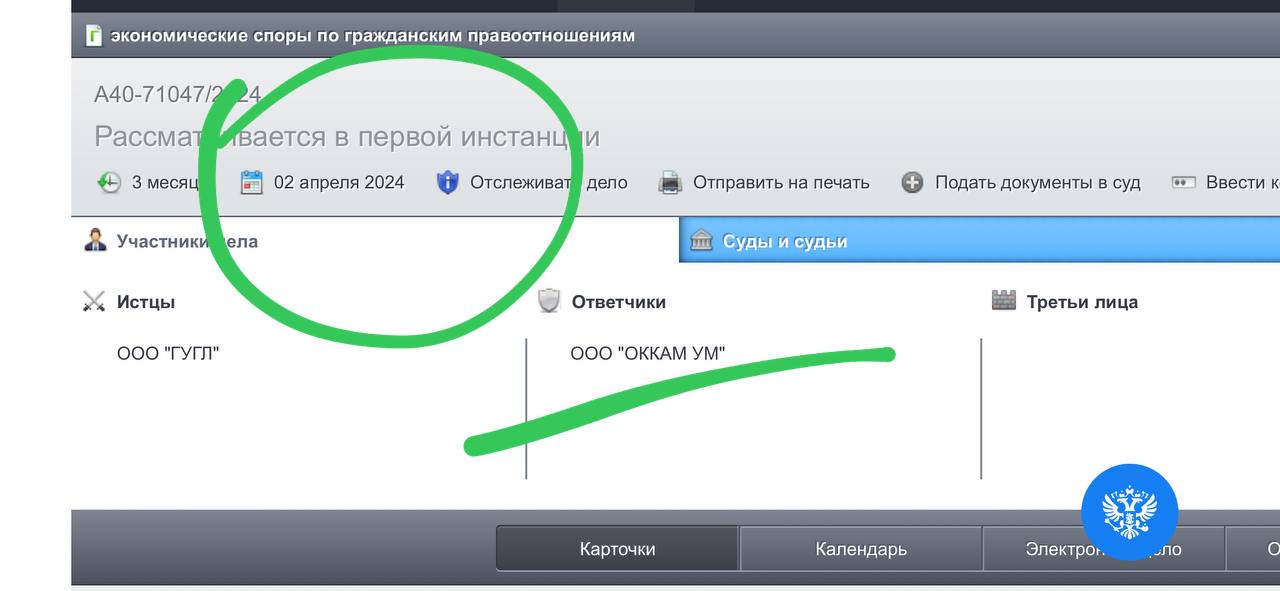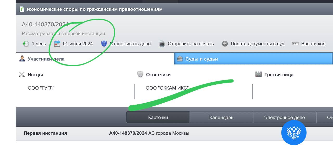 🤓 И еще немного судебочки. Иск к ОККАМ со стороны Гугля пришел вчера в суд. Если первым ответчиком было ООО «Оккам УМ», то теперь это — ООО «Оккам ИКС».