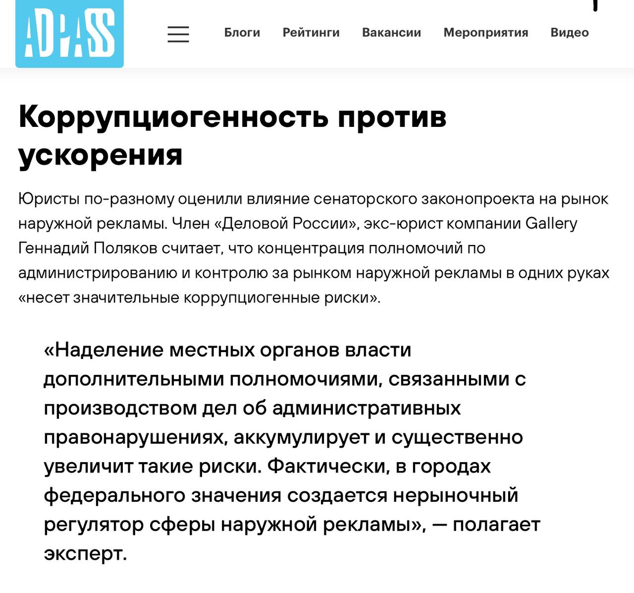 Сегодня Адпасс обращает внимание общественности еще на одну возможную формируемую лазейку для «особенных условий». Власти Москвы, Петербурга и Севастополя теперь смогут без суда признавать незаконной наружную рекламу и выписывать нарушителям штрафы до 0,5 млн рублей. Такой законопроект приняла вчера во втором чтении Госдума.