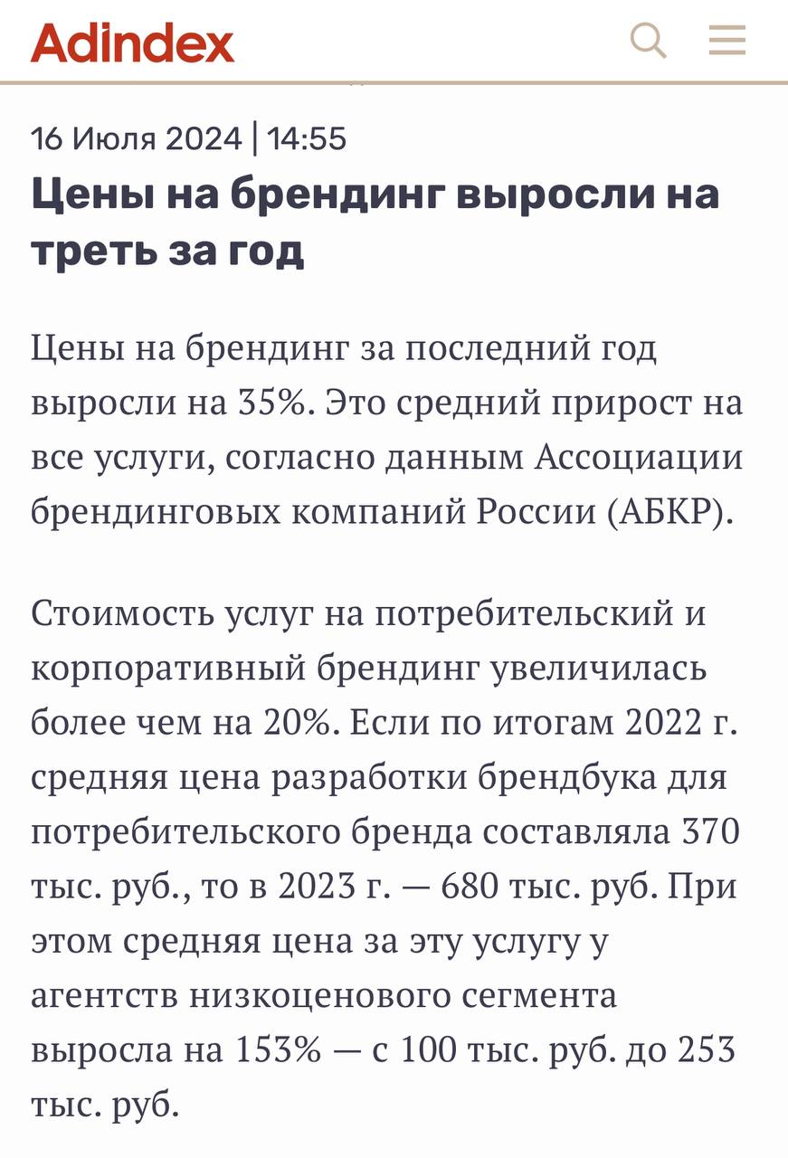 🤓 При условии разлета ценника за одинаковый обьем работ у ТОП 5 брендинговых агентств в 2-3 раза, о какой «средней цене работ» может идти речь?