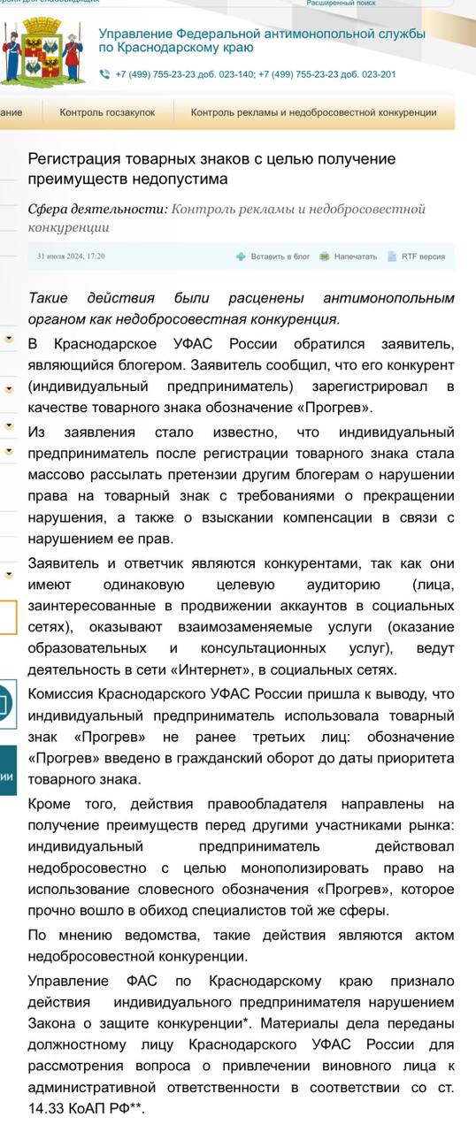 В итоге УФАС Краснодарского края нахлобучил инфобизнесменшу и признал действия «получением недопустимого преимущества»…