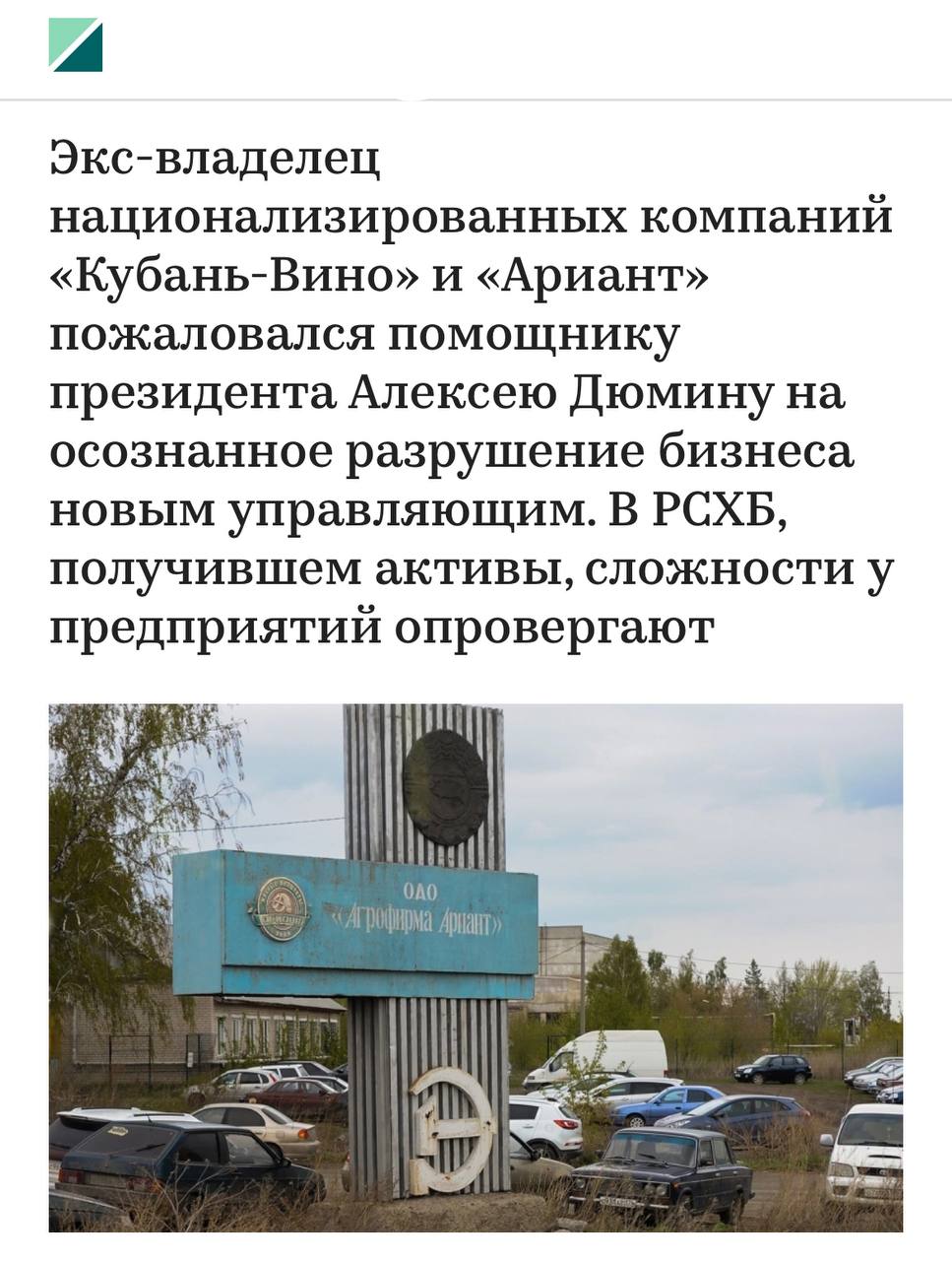 Группа «Ариант» обратилась к помощнику президента, секретарю Госсовета Алексею Дюмину с просьбой обратить внимание на судебное дело о национализации ее активов и на то, что с ними происходит после передачи в госсобственность под управление структуры Россельхозбанка. В частности, «Ариант» попросил секретаря Госсовета «защитить и сохранить уникальный агропромышленный холдинг», в состав которого входили крупнейший производитель вина «Кубань-Вино», виноградарское предприятие агрофирма «Южная», производитель алкоголя «Центр пищевой индустрии — Ариант», а также специализирующаяся на разведении свиней агрофирма «Ариант».