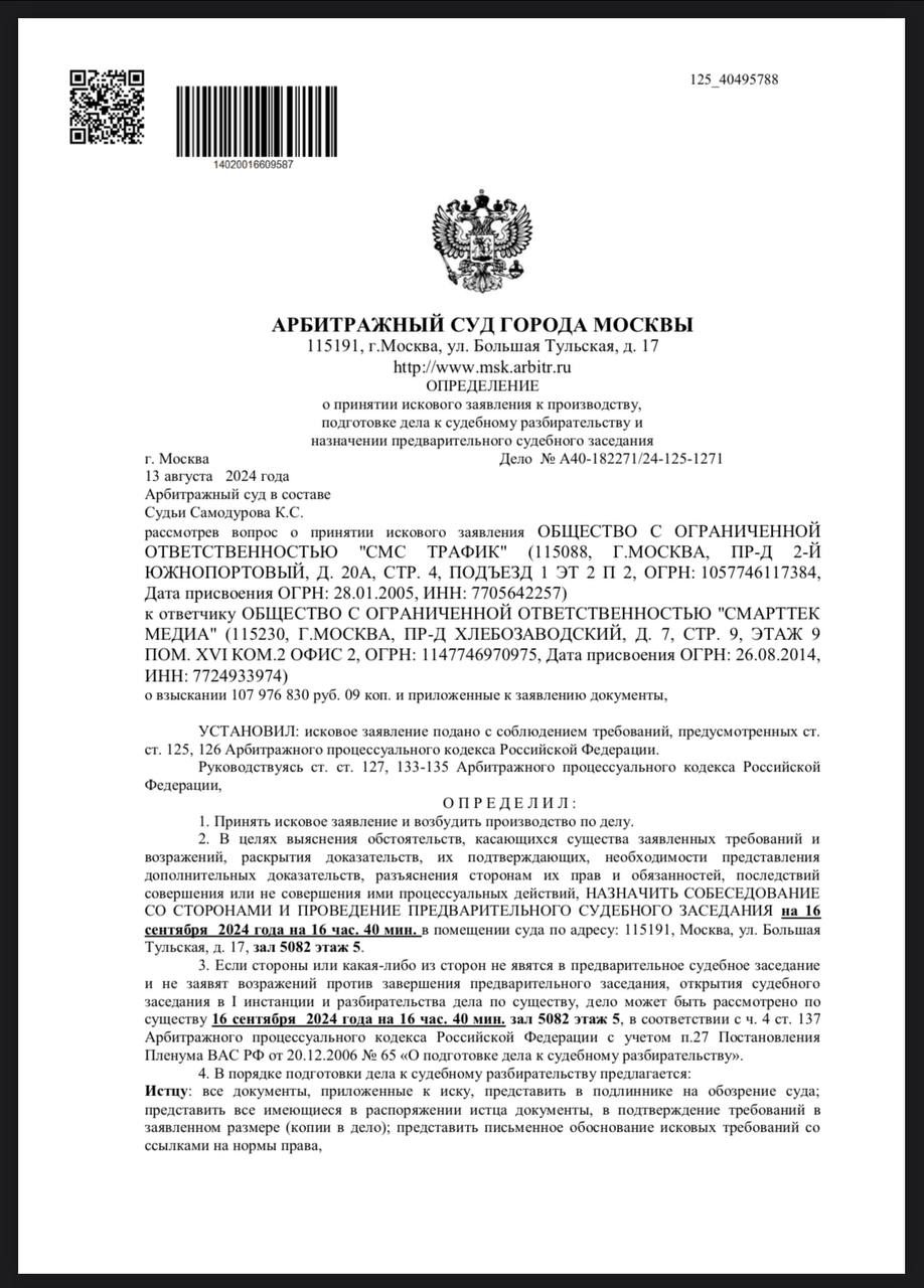 🤓 Крупный судебный спор на рынке рассылок. Агентство «СМС-трафик» требует 108 миллионов рублей от агентства «Смарттек Медиа».