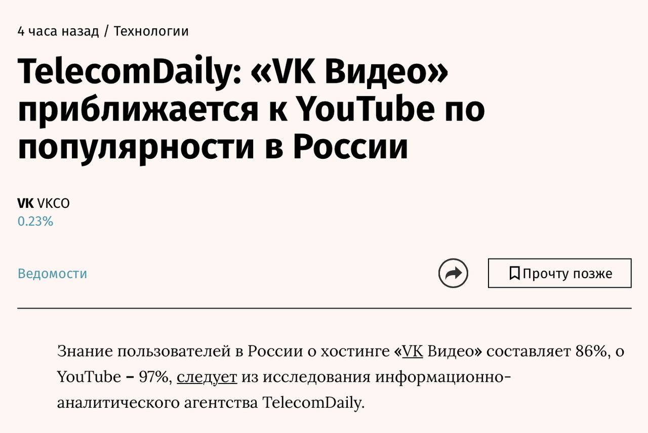 🤓 Искусство манипуляции смыслами. ВК продвигает в деловых СМИ идею, что они не хуже Ютьюба. Полагаем, аудитория — акционеры сервиса.
