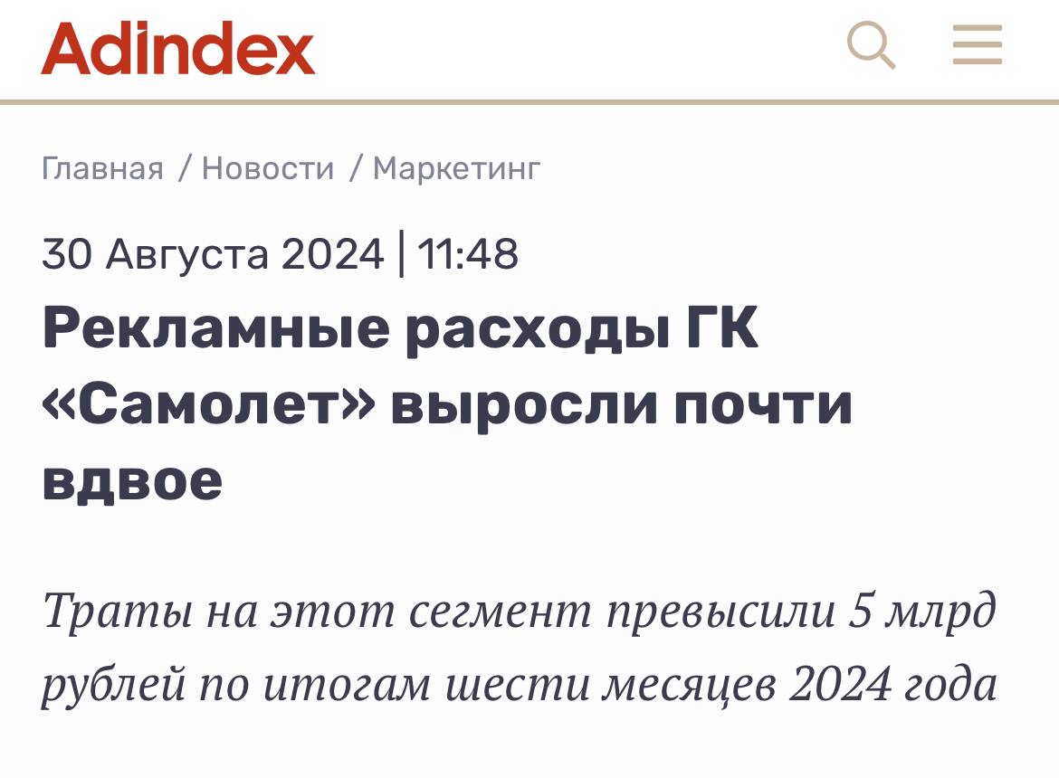 Группа «Самолет» увеличила расходы на рекламу по итогам первого полугодия 2024 г. почти в два раза. Показатель достиг 5,3 млрд руб. по сравнению с 2,8 млрд руб. за тот же период 2023 г., говорится в финансовом отчете девелопера.