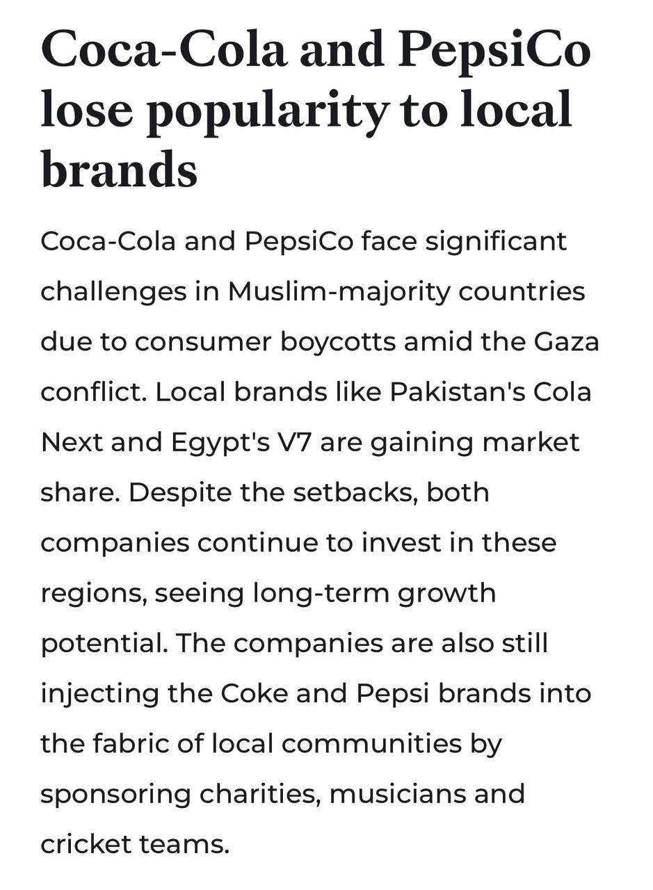 Coca-Cola и PepsiCo сталкиваются со значительными трудностями в странах с мусульманским большинством из-за потребительских бойкотов на фоне конфликта в секторе Газа. Местные бренды, такие как пакистанская Cola Next и египетская V7, набирают долю рынка.