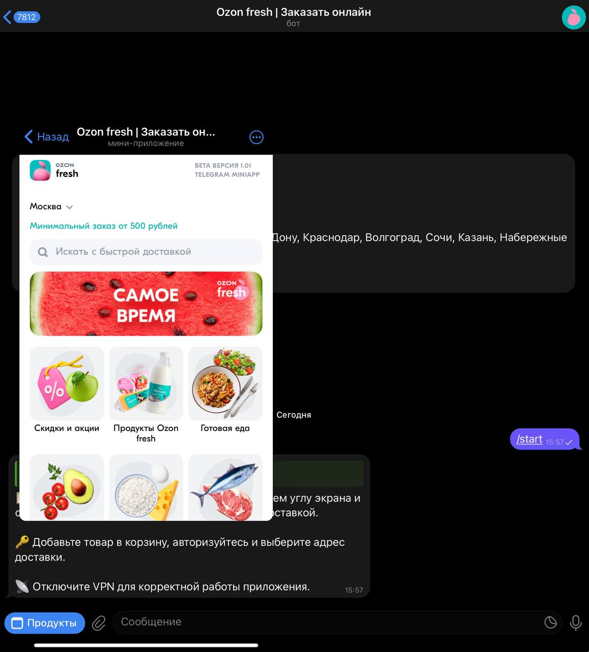 😂 Особенно удобно для админов. Не вставая с дивана в своей новой хате в спальнике, и не отходя от рабочего экаунта. Заказ продуктов из тг-бота от Озон фреш. Главное не путать формы отправки, чтобы не плодить нетудашечки.