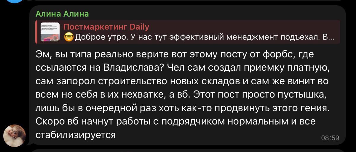 🤓 Нормуль. Спустя полтора месяца после начала конфликта вокруг Wildberries, сторона RUSS наняла агентство по работе с репутацией для массовой отписки в комментах социальных сетей. Поглотить беспечный маркетплейс столило хотя бы для того, чтобы наладить им работу с публичным полем.