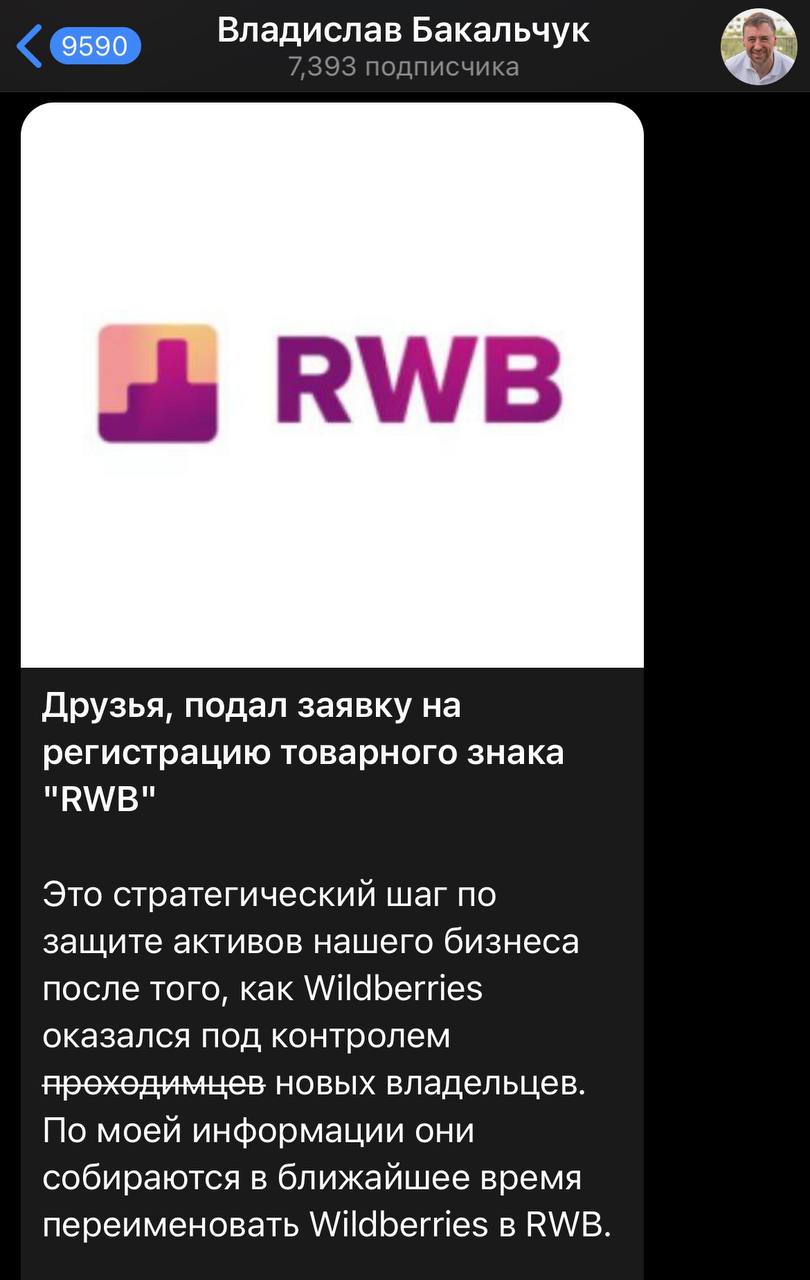 🤓 Бакальчук-муж подал на регистрацию товарный знак RWB и ругает RUSS проходимцами у себя в канале.