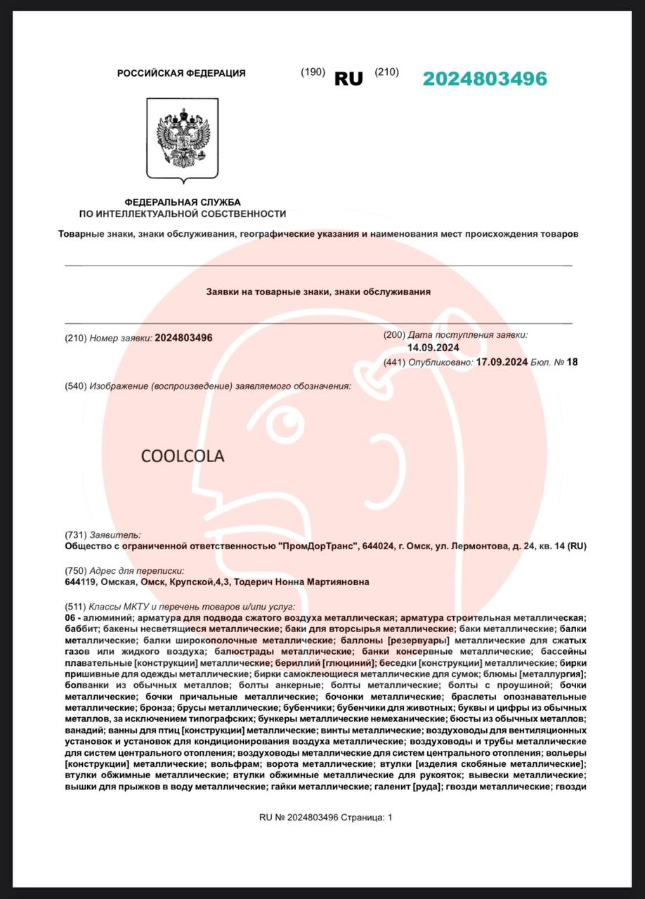 😵 Маленькая компания «Промдортранс» из Омска (оборот 140 тыс/год) массово подает на регистрацию бренды Кока Колы в непищевых категориях.