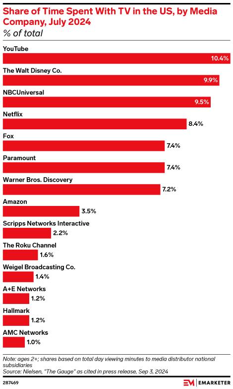 🤓 Согласно данным Nielsen за июль 2024 года, на YouTube приходится 10,4% ежедневного времени, проводимого с телевизором в США