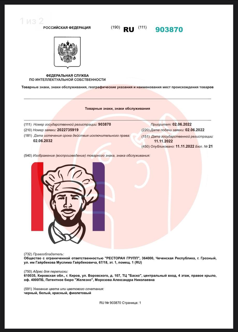 Роспатент отказал владельцу бренда KFC компании «Кентукки Фраид Чикен Интернешенел Холдингс ЛЛС», которая попыталась оспорить право использования товарного знака в виде портретного изображения мужчины с бородой в поварском колпаке на фоне двух цветных полос — красной и фиолетовой, принадлежащего компании ООО «Ресторан Групп». Данные об этом содержатся в базе Федеральной службы интеллектуальной собственности.