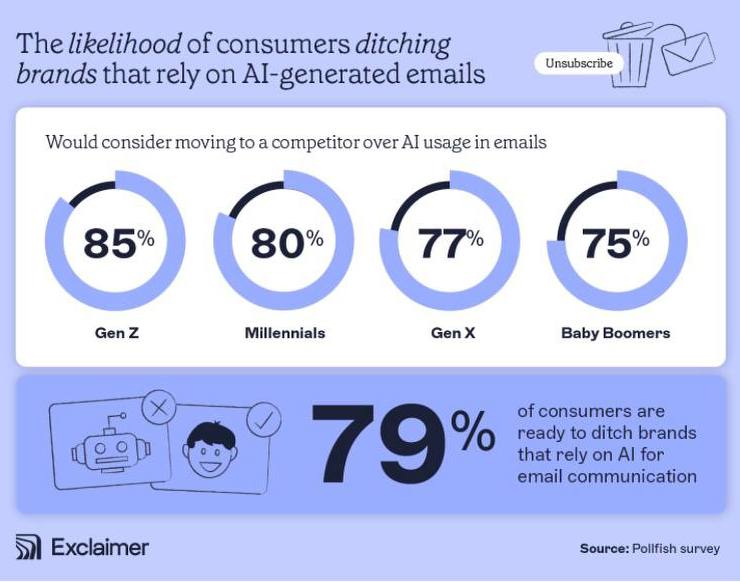 В исследовании “Индивидуальный подход”, проведенном платформой Exclaimer, было опрошено 1000 человек из четырех поколений в возрасте от 16 до 54 лет. Его цель - изучить, как чрезмерное использование искусственного интеллекта в электронной почте может повлиять на восприятие потребителей.