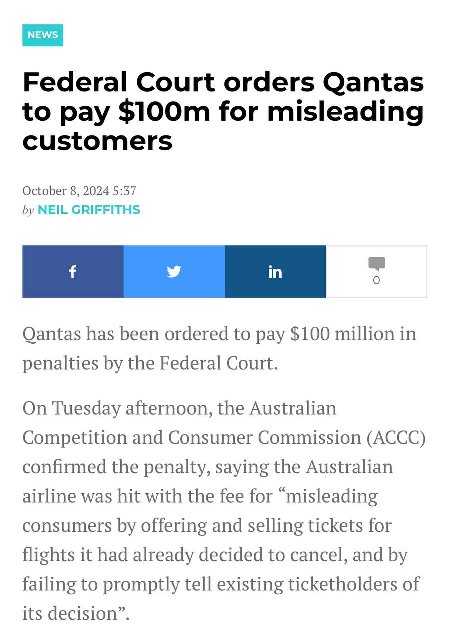 ΠΡΡΠΏΠ½Π΅ΠΉΡΠ°Ρ Π°Π²ΡΡΡΠ°Π»ΠΈΠΉΡΠΊΠ°Ρ Π°Π²ΠΈΠ°ΠΊΠΎΠΌΠΏΠ°Π½ΠΈΡ Qantas ΠΏΡΠΈΠ·Π½Π°Π»Π°ΡΡ, ΡΡΠΎ Π²Π²ΠΎΠ΄ΠΈΠ»Π° Π² Π·Π°Π±Π»ΡΠΆΠ΄Π΅Π½ΠΈΠ΅ ΡΠ²ΠΎΠΈΡ ΠΊΠ»ΠΈΠ΅Π½ΡΠΎΠ², ΠΏΡΠΎΠ΄Π°Π² 86000 Π±ΠΈΠ»Π΅ΡΠΎΠ² Π½Π° ΠΎΡΠΌΠ΅Π½Π΅Π½Π½ΡΠ΅ ΡΠ΅ΠΉΡΡ Π½Π° ΡΡΠΌΠΌΡ 171 ΠΌΠ»Π½ $, Π·Π½Π°Ρ ΠΏΡΠΈ ΡΡΠΎΠΌ Π΄ΠΎ ΠΏΡΠΎΠ΄Π°ΠΆΠΈ Π±ΠΈΠ»Π΅ΡΠΎΠ², ΡΡΠΎ ΡΠ΅ΠΉΡΡ ΠΎΡΠΌΠ΅Π½Π΅Π½Ρ. ΠΠΎΠΌΠΏΠ°Π½ΠΈΡ ΠΎΠ±ΡΠ·Π°Π»ΠΈ Π²ΡΠΏΠ»Π°ΡΠΈΡΡ ΠΊΠΎΡΠΌΠΈΡΠ΅ΡΠΊΠΈΠΉ ΡΡΡΠ°Ρ Π² 100 ΠΌΠ»Π½ $.