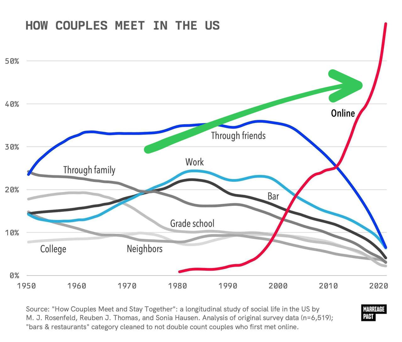 В США уже порядка 60% пар находят друг друга через интернет. При этом, значимость традиционных способов знакомства с партнером (дружеская среда, офис, бар..) неминуемо стремится к нулю.