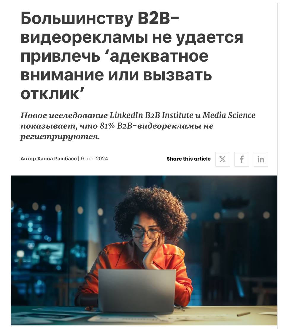 Π‘ΠΎΠ³Π»Π°ΡΠ½ΠΎ ΡΠ²Π΅ΠΆΠ΅ΠΌΡ ΠΈΡΡΠ»Π΅Π΄ΠΎΠ²Π°Π½ΠΈΡ ΡΠ΅ΠΊΠ»Π°ΠΌΠ½ΠΎ-ΠΈΡΡΠ»Π΅Π΄ΠΎΠ²Π°ΡΠ΅Π»ΡΡΠΊΠΎΠΉ ΠΊΠΎΠΌΠΏΠ°Π½ΠΈΠΈ Media Science, 82% b2b Π²ΠΈΠ΄Π΅ΠΎΡΠ΅ΠΊΠ»Π°ΠΌΡ Π½Π΅ ΠΏΡΠΈΠ²Π»Π΅ΠΊΠ°ΡΡ “Π²Π½ΠΈΠΌΠ°Π½ΠΈΡ” Π·ΡΠΈΡΠ΅Π»Π΅ΠΉ ΠΈ Π½Π΅ “Π²ΡΠ·ΡΠ²Π°ΡΡ ΠΎΡΠΊΠ»ΠΈΠΊ Π±ΡΠ΅Π½Π΄Π°”.